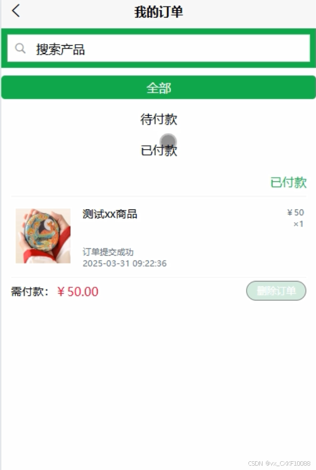 我的订单:用户可以查看所有订单详情,支持订单搜索、取消、删除、售后申请等操作。订单包括待付款、已付款、已取消、售后/退款等状态,用户可以根据需求进行相应操作。