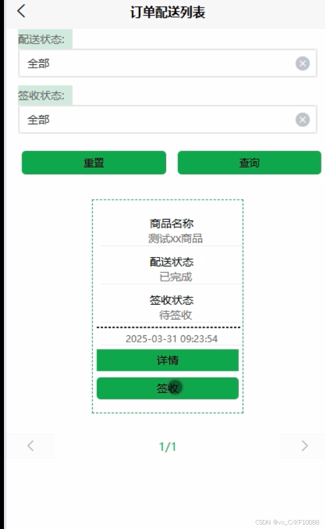 订单配送:用户可以查看订单配送的详细信息,并进行签收操作,支持搜索、查询、重置等功能。