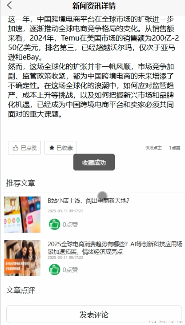 新闻资讯:用户可以浏览商城的资讯内容,查看详细信息,也可以进行搜索、点赞、收藏、评论以及回复删除等操作。新闻资讯为用户提供了丰富的产品和市场信息,方便他们做出购买决策。