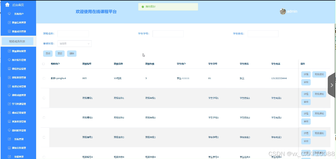 - 系统用户:包括管理员、学生、教师的查询、密码重置、删除、查看详细信息等操作,方便管理员对平台用户进行有效管理。
