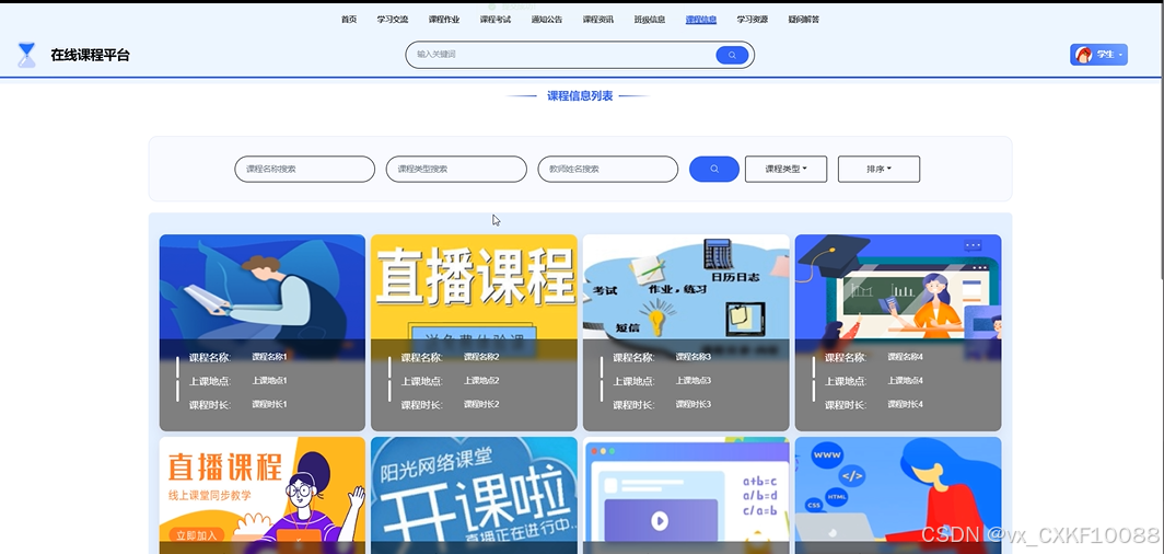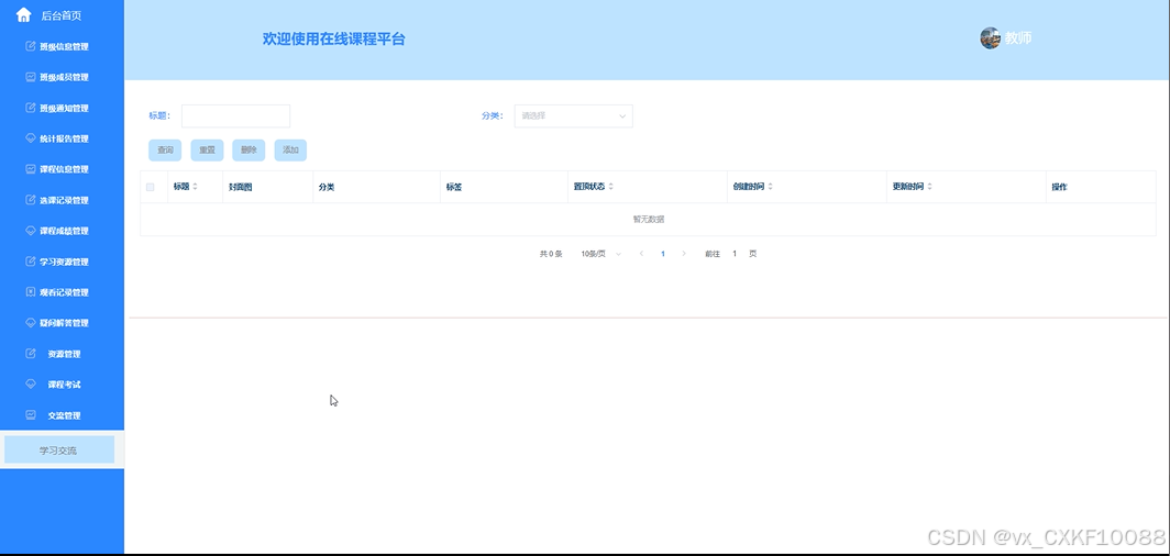 - 课程信息管理:提供课程信息列表、查询、重置、删除、详情、查看评论、课程信息添加等功能。教师可以轻松管理课程信息,确保课程内容的及时更新。
