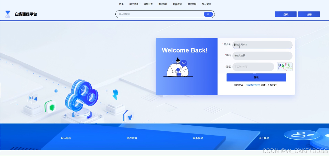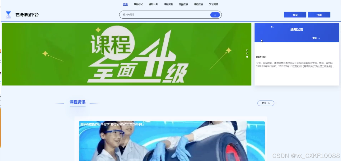 - 首页:首页上展示了一个轮播图,用于突出显示最新或重要的信息。用户可以在这里进行学习交流,查看课程考试的相关信息,浏览通知公告和课程资讯。此外,班级信息和课程信息也在这里列出,方便用户了解。用户还可以找到学习资源和课程信息推荐,以及学习资源推荐。首页的底部提供了登录和注册的快捷入口。