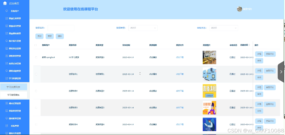 - 学习资源管理:提供学习资源列表、查询、重置、删除、详情、查看评论、学习资源添加等功能。教师可以为学生提供丰富的学习资源,丰富学生的学习体验。
