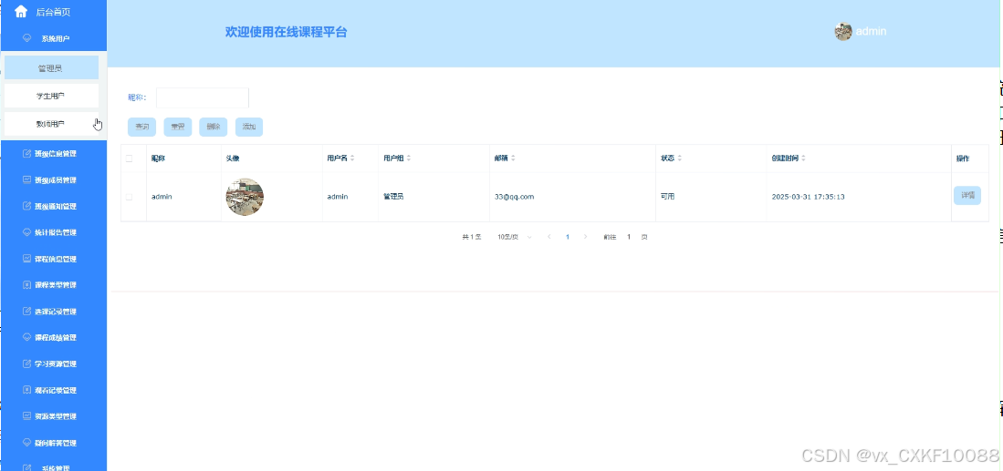 - 课程信息管理:管理课程列表,包括查询、重置、删除、查看详细信息、查看评论、添加新课程等,确保课程内容的丰富性和更新速度。