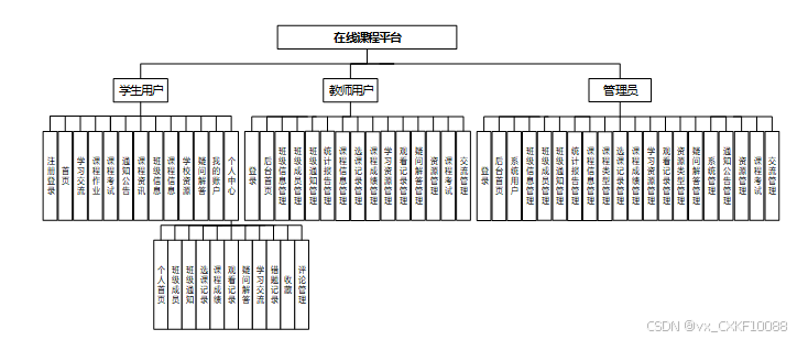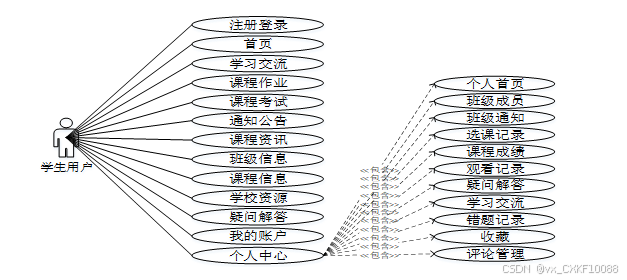 - 个人中心:用户可以访问个人首页,查看自己所在的班级成员列表,进行查询操作,重置个人信息,查看个人详情,接收班级通知,查看选课记录和课程成绩,管理观看记录,解决疑问,参与学习交流,查看错题记录,管理收藏的内容,以及管理评论。