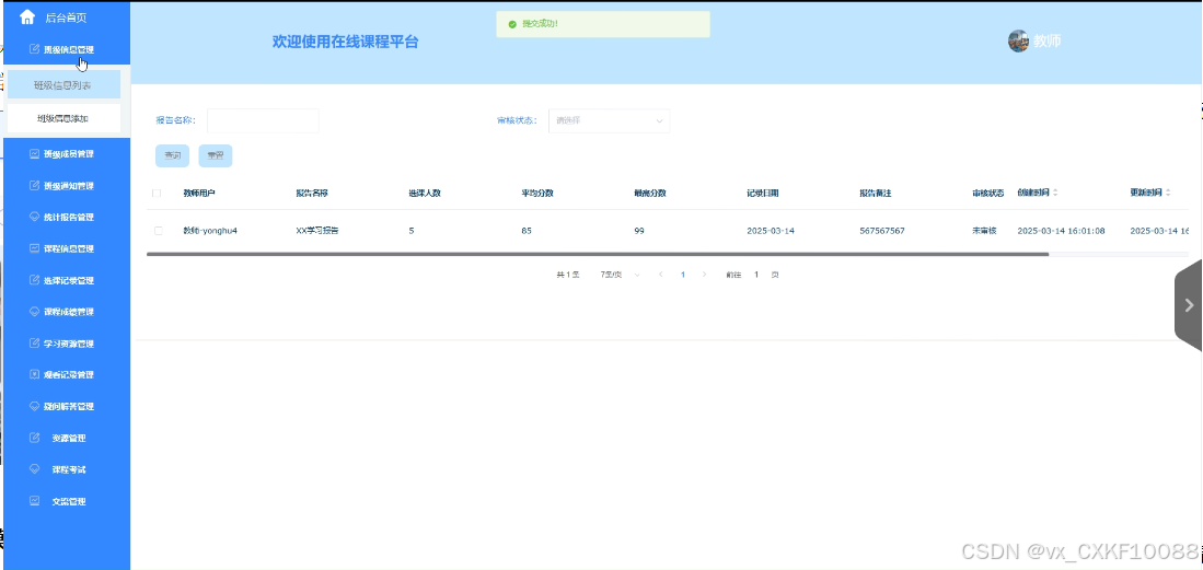 - 统计报告管理:提供统计报告列表、查询、重置等功能。教师可以生成和查看各类统计报告,为教学决策提供数据支持。