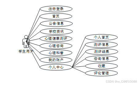 在大学生心理健康智能测评预警系统中学生用户包含注册登录、首页、公告信息、学校资讯、心理健康测评、心理咨询、心理科普、我的账户、个人中心等功能。学生用户用例图如下所示: