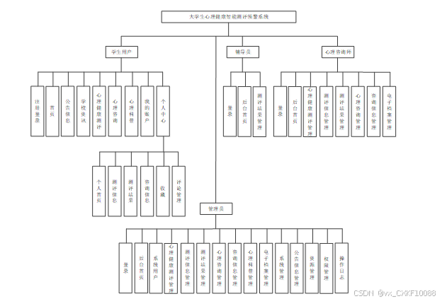 本大学生心理健康智能测评预警系统根据使用者划分,主要包含学生用户、辅导员、心理咨询师和管理员四大角色,每个角色对应的主要功能说明如下所示:
