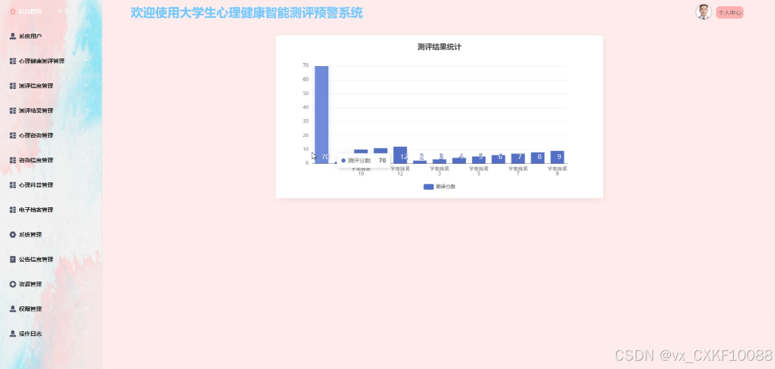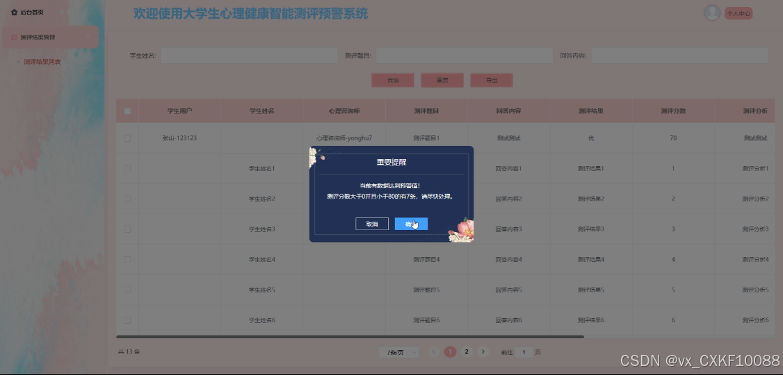 - 测评结果管理:管理员可管理所有测评结果信息,包括查询、删除测评结果,支持批量导出测评结果报表,实现心理指数阈值预警提醒(当测评分数大于0小于80时自动弹出预警提醒)。