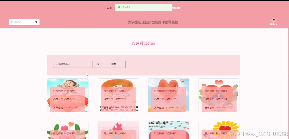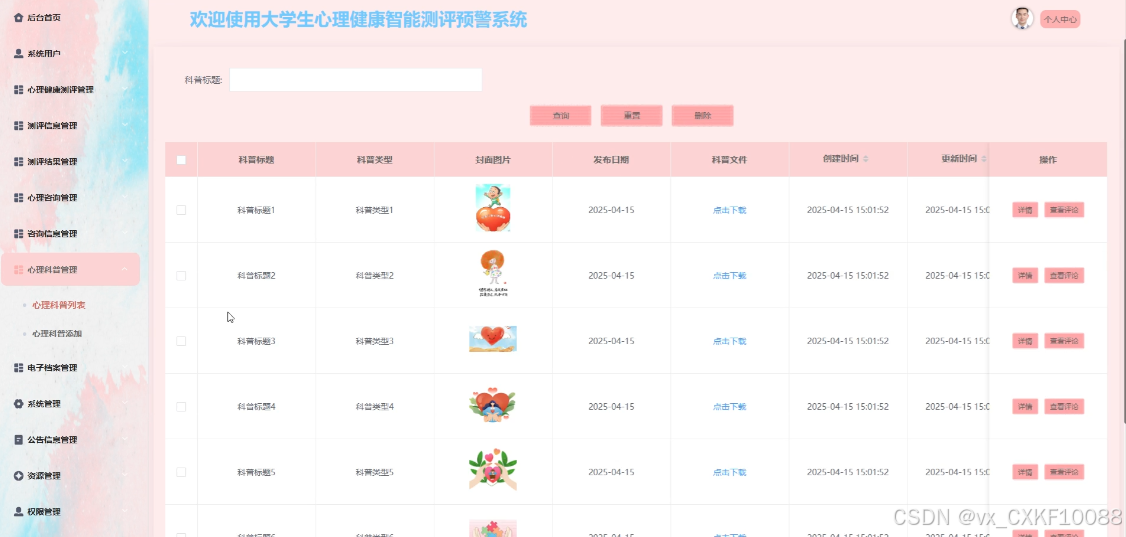 - 心理科普:提供心理科普信息展示,支持关键字、排序搜索,学生用户可以浏览心理科普,并点赞、收藏和评论心理科普。