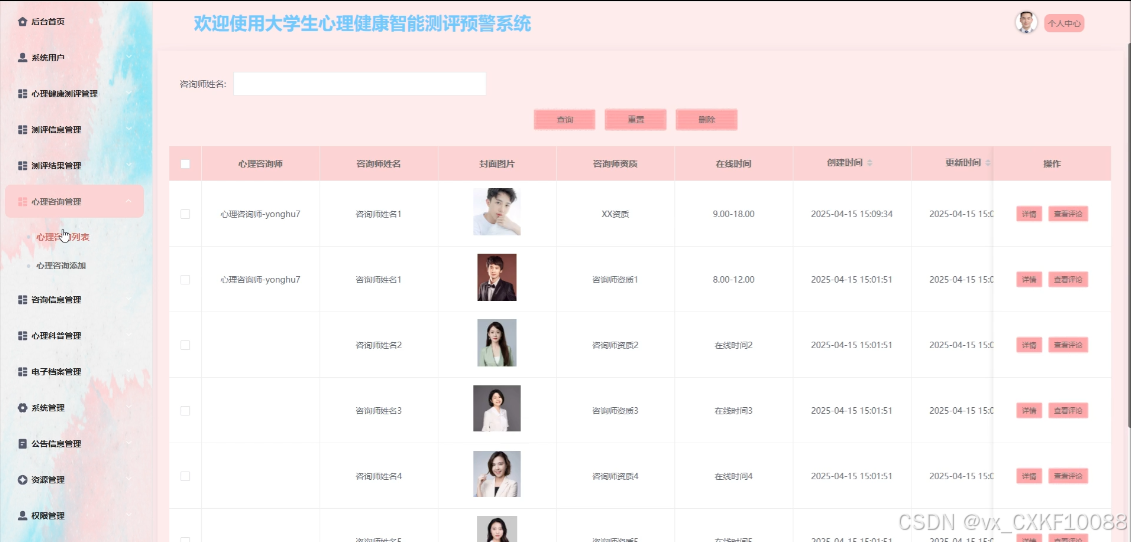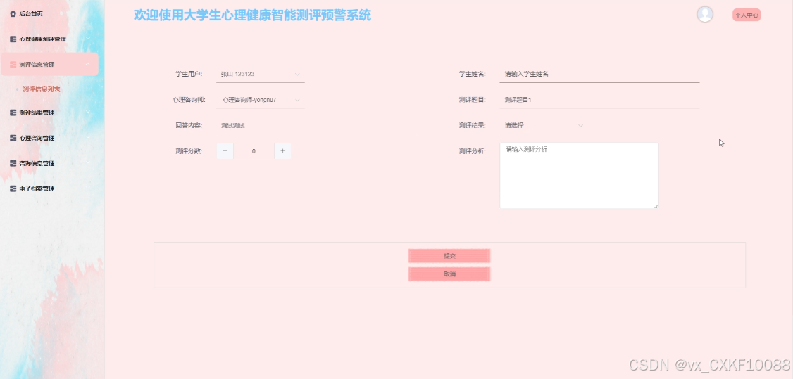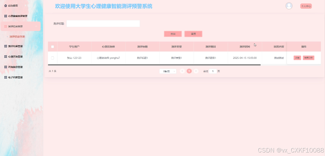 - 测评信息管理:心理咨询师可管理提交给自己的测评信息,支持查询、删除测评信息,提供结果分析操作。