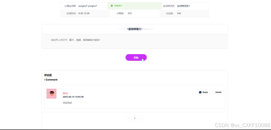 - 心理咨询:提供心理咨询信息展示,支持关键字、排序搜索,学生用户可以浏览心理咨询师信息,并点赞、收藏和评论心理咨询,实现咨询功能。