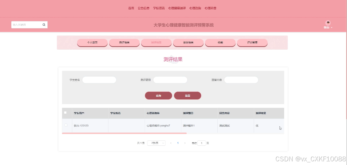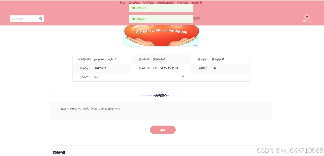 - 心理健康测评:提供心理健康测评信息展示,支持关键字、排序搜索,学生用户可以浏览心理健康测评,并点赞、收藏和评论心理健康测评,实现测评功能。