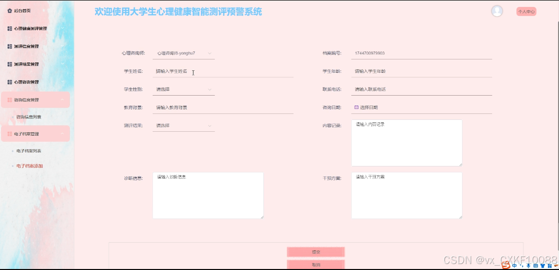 - 电子档案管理:心理咨询师可管理自己的电子档案信息,包括创建、编辑、删除和查询电子档案。