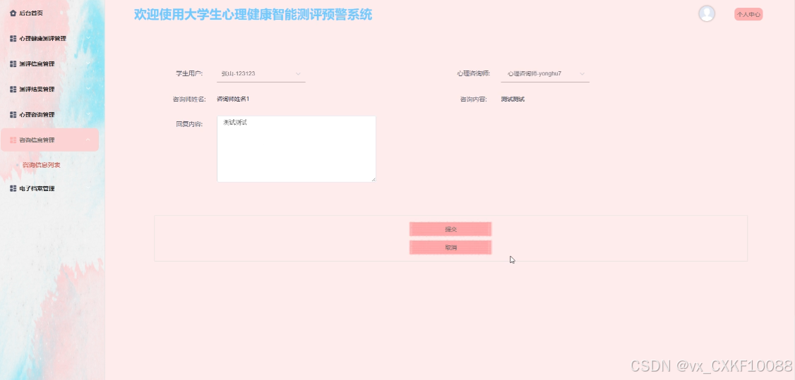 - 咨询信息管理:心理咨询师可管理提交给自己的咨询信息,支持查询、删除咨询信息,负责回复学生发送给自己的心理咨询。