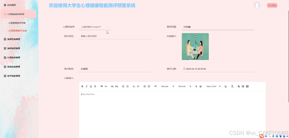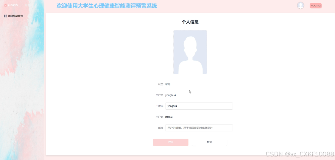 - 个人中心:提供个人首页、测评信息、测评结果、咨询信息、收藏、评论管理等子菜单功能链接,学生用户可根据需求对其进行管理。具体包括,学生用户可查询自己的测评信息,查阅心理咨询师给出测评结果(实现预警提醒);支持查询和查看心理咨询师回复的咨询内容;可查看和删除已收藏的系统信息;可跟踪和查看已发表的评论内容。