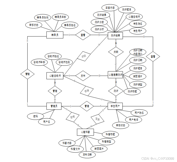 - 测评结果管理:心理咨询师可管理自己的测评结果信息,包括查询、更新及删除测评结果,负责根据学生的测评信息进行评估及分析,实现心理指数阈值预警提醒。
