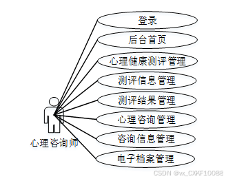 大学生心理健康智能测评预警系统中心理咨询师涵盖了登录、后台首页、心理健康测评管理、测评信息管理、测评结果管理、心理咨询管理、咨询信息管理、电子档案管理等功能。心理咨询师用例图如下所示: