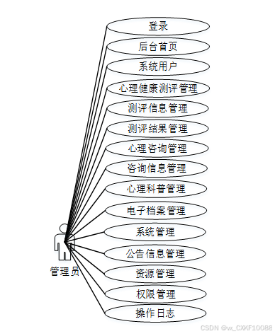 大学生心理健康智能测评预警系统中管理员则集成了登录、后台首页、系统用户、心理健康测评管理、测评信息管理、测评结果管理、心理咨询管理、咨询信息管理、心理科普管理、电子档案管理、系统管理、公告信息管理、资源管理、权限管理、操作日志等功能。管理员用例图如下所示: