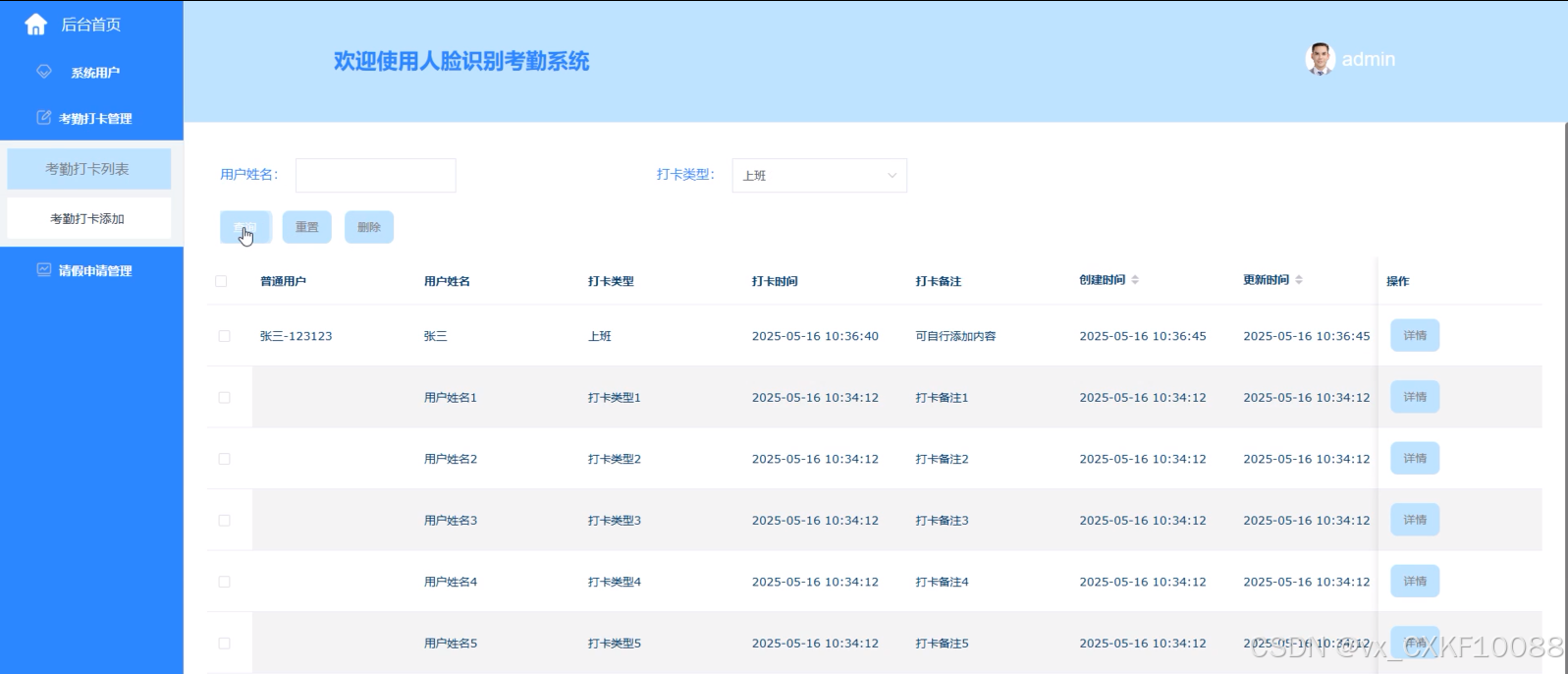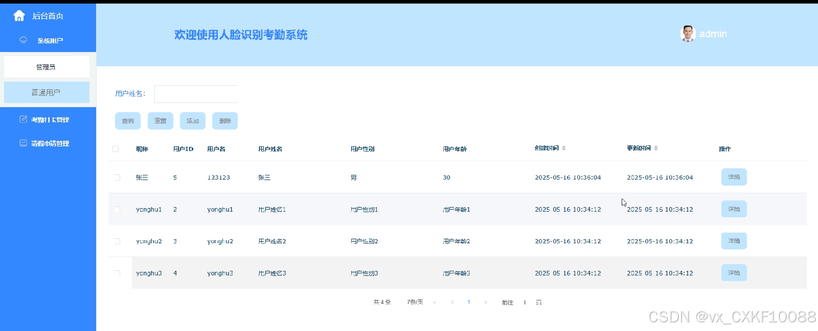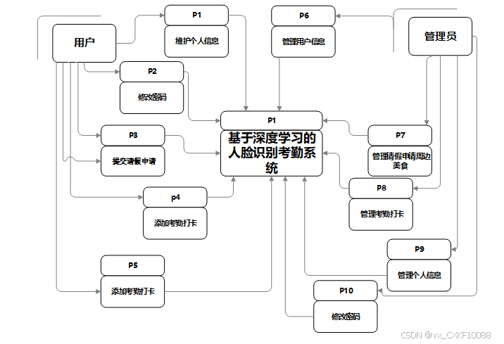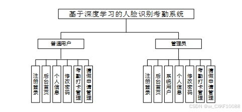 基于深度学习的人脸识别考勤系统划分为了普通用户模块和管理员模块两大部分。