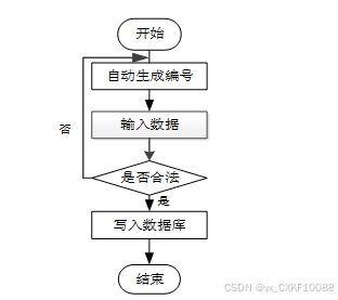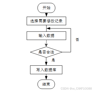 用户首先选择需要修改的记录,输入修改后的数据,系统判断输入数据是否合法。若数据不合法,提示重新输入,若数据合法,则将修改后的数据写入数据库,完成操作后流程结束。修改信息流程图如下图所示。