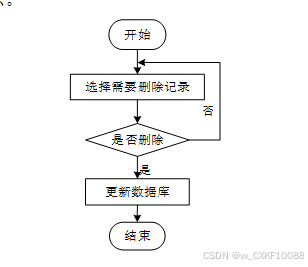 用户选择需要删除的记录后,系统判断是否确认删除。若未确认,返回选择环节,若确认删除,则更新数据库,删除对应记录,完成操作后流程结束。删除信息流程图如下图所示。