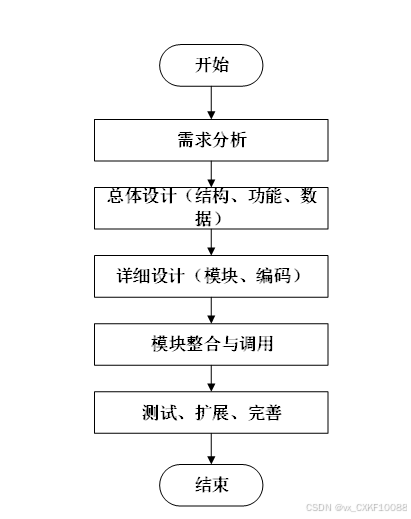 系统开发流程的主要步骤,从需求分析到系统完成的全过程。流程包括需求分析、总体设计(结构、功能、数据)、详细设计(模块、编码)、模块整合与调用,以及测试、扩展和完善,最终完成系统的开发。本系统的开发流程如下图所示
