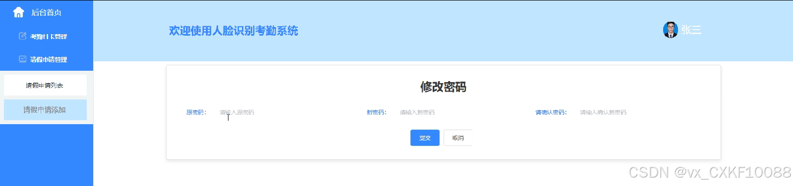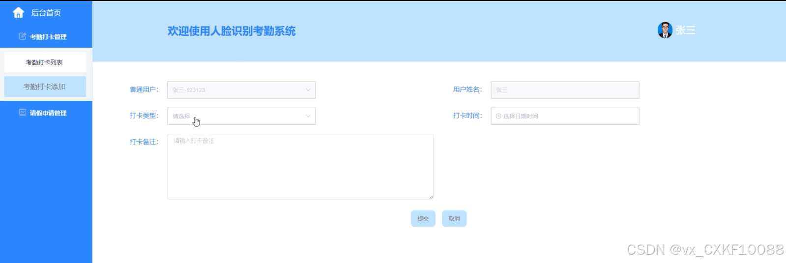 后台首页:用户登录后进入后台首页,可查看个人考勤状态、打卡记录、请假审批进度等核心信息,界面简洁直观。