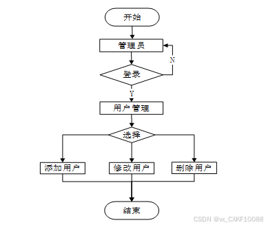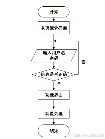用户首先进入系统登录界面,输入用户名和密码后,系统验证信息是否正确。若验证失败,返回登录界面重新输入,若验证成功,则进入功能界面,执行相应功能处理后结束操作流程。操作流程如下图所示。