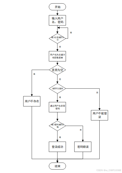 用户输入用户名和密码后,系统先检查输入是否为空,再验证用户名是否存在,若存在则通过用户名获取密码并校验。若密码正确则登录成功,否则提示密码错误。若用户名不存在或无法登录,提示用户操作无效。如下图所示。