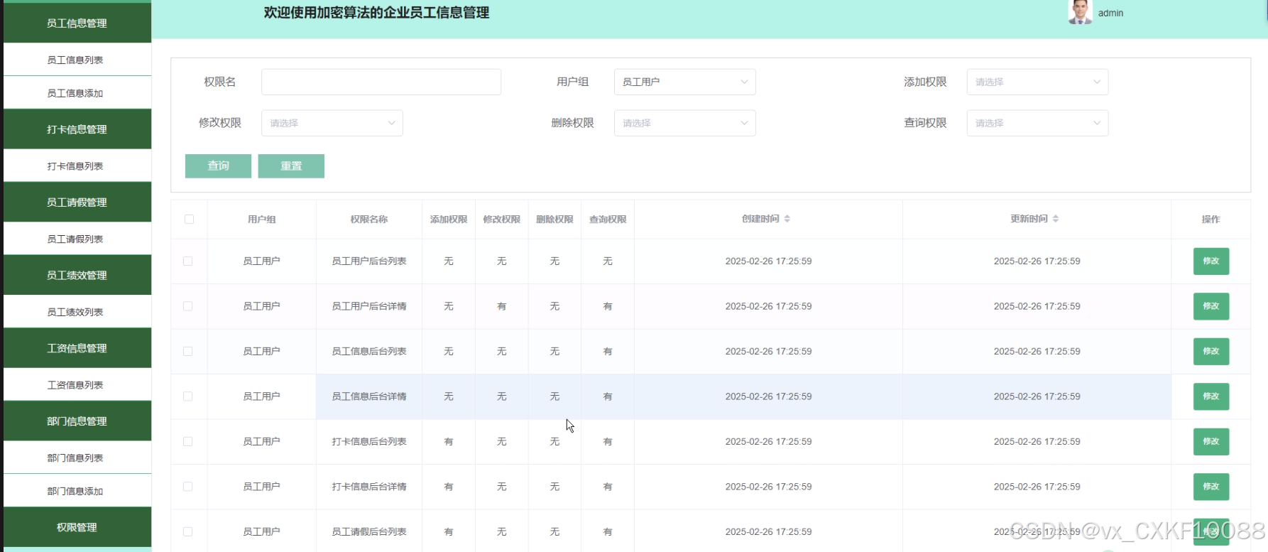 (9)权限管理:展示权限列表,管理系统权限。可通过权限名、用户组等查询权限。可修改不同角色权限。