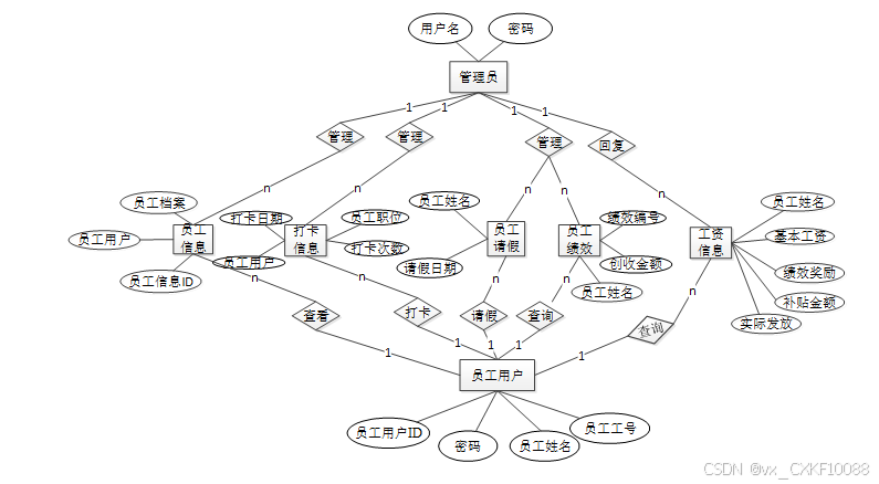 借助先进的系统,ER图使其他用户可以快速轻松地了解系统的功能以及他们之间的关系。SPRINGBOOT 加密算法的企业员工信息管理系统中管理员、员工用户、员工信息、打卡信息、员工请假、员工绩效、工资信息等E-R实体关系图。