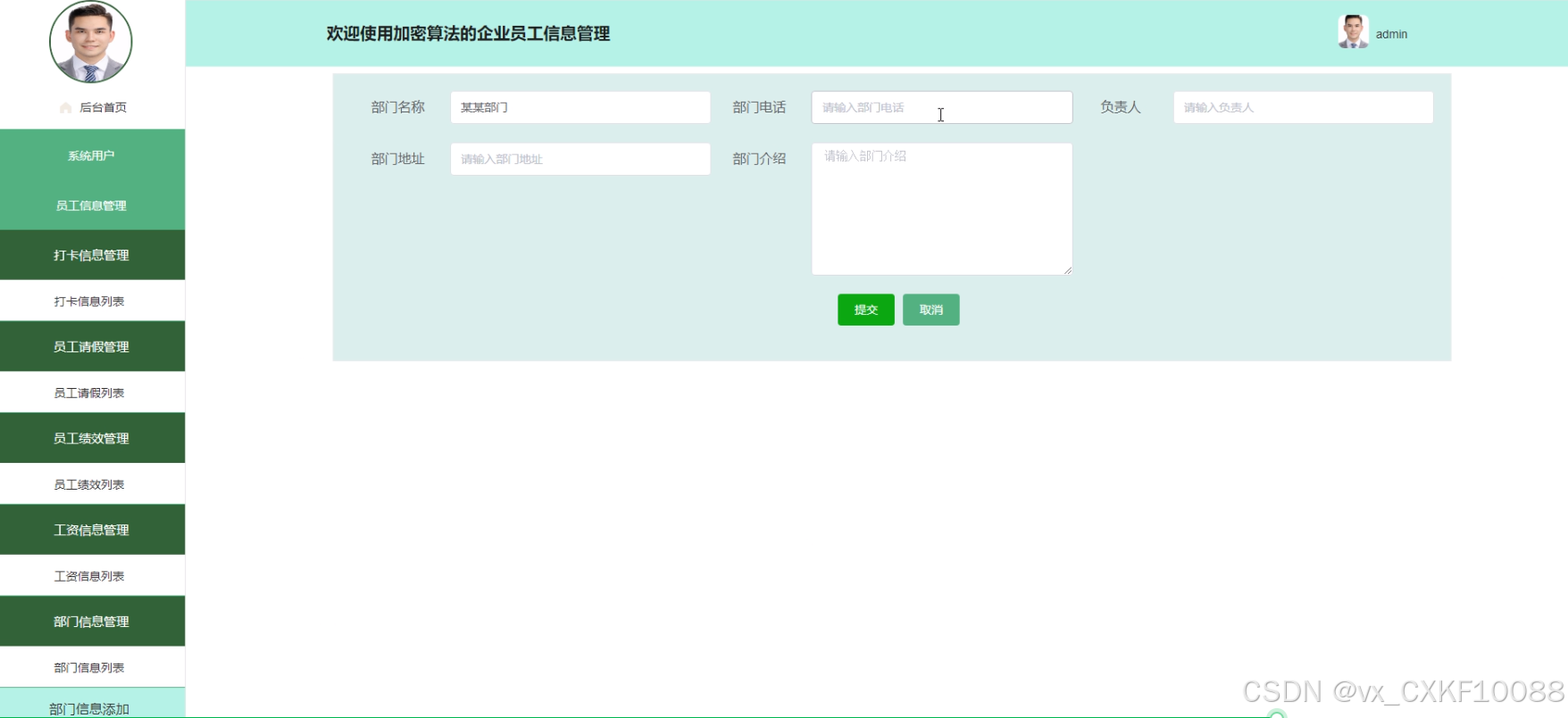 部门信息管理:包含部门信息列表跟部门信息添加。部门信息列表可查看所有部门信息,可通过部门名称、负责人搜索、查看部门详情、删除部门信息。部门信息添加可添加新的部门信息。部门添加界面如下图所示。