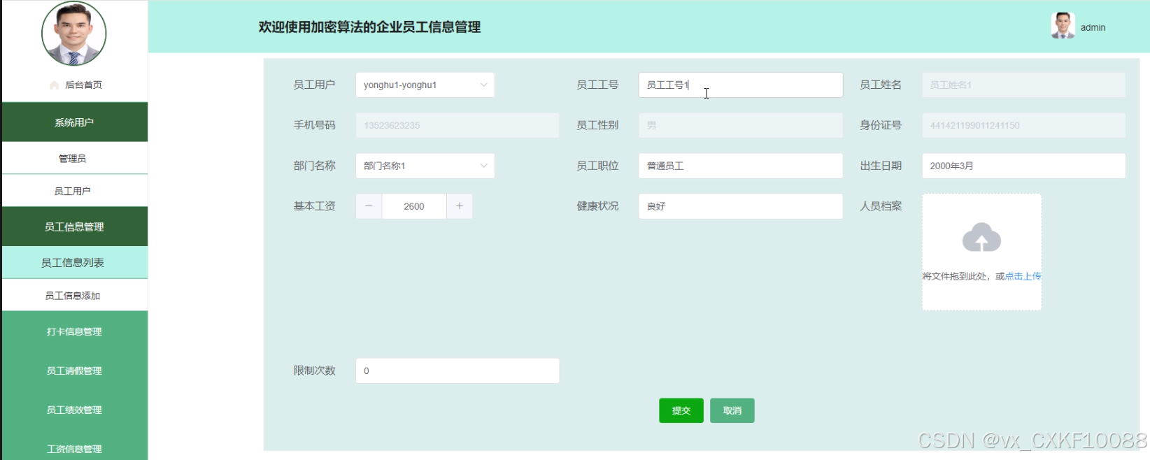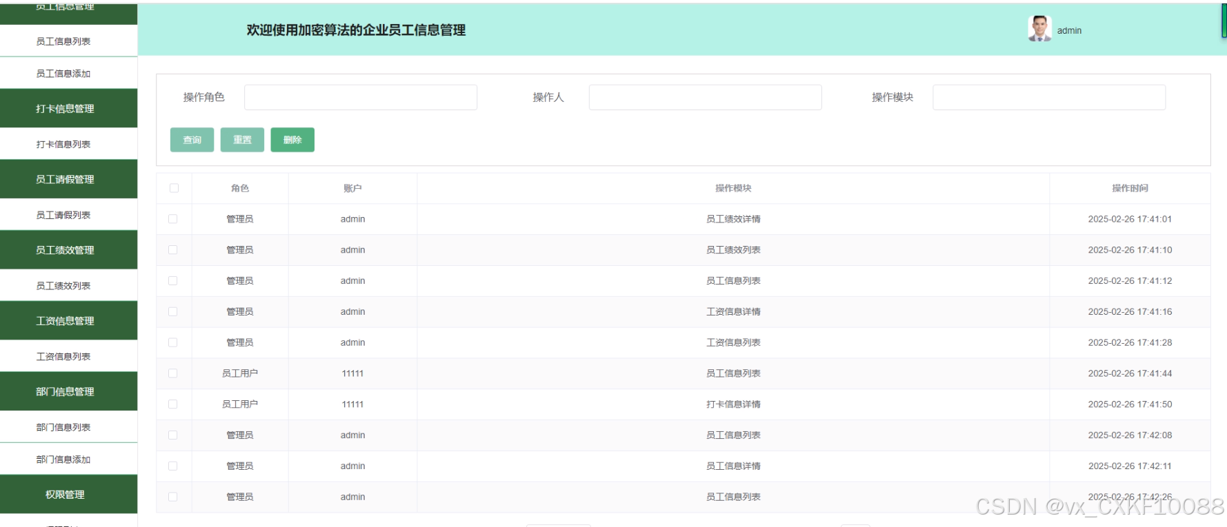 SPRINGBOOT 加密算法的企业员工信息管理系统系统系统包含员工用户、管理员两个角色划分,每个角色对应的主要功能如下:
