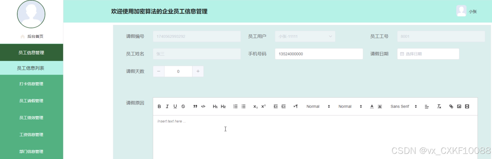 (6)员工请假管理:展示员工个人所有请假信息,点击查看请假详情。