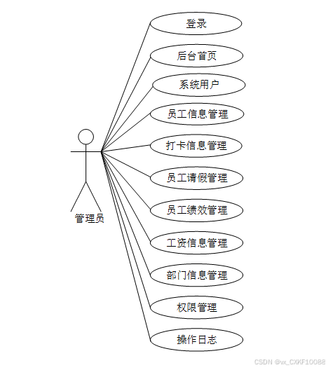 SPRINGBOOT 加密算法的企业员工信息管理系统系统中管理员包含登录、后台首页、系统用户、员工信息管理、打卡信息管理、员工请假管理、员工绩效管理、工资信息管理、部门信息管理、权限管理、操作日志等功能。管理员用例图如下所示: