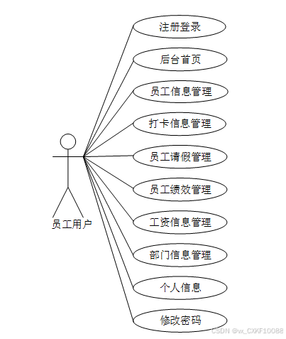 SPRINGBOOT 加密算法的企业员工信息管理系统系统中员工用户包含注册、登录、后台首页、员工信息管理、打卡信息管理、员工请假管理、员工绩效管理、工资信息管理、部门信息管理、个人信息、修改密码等功能。员工用户用例图如下所示: