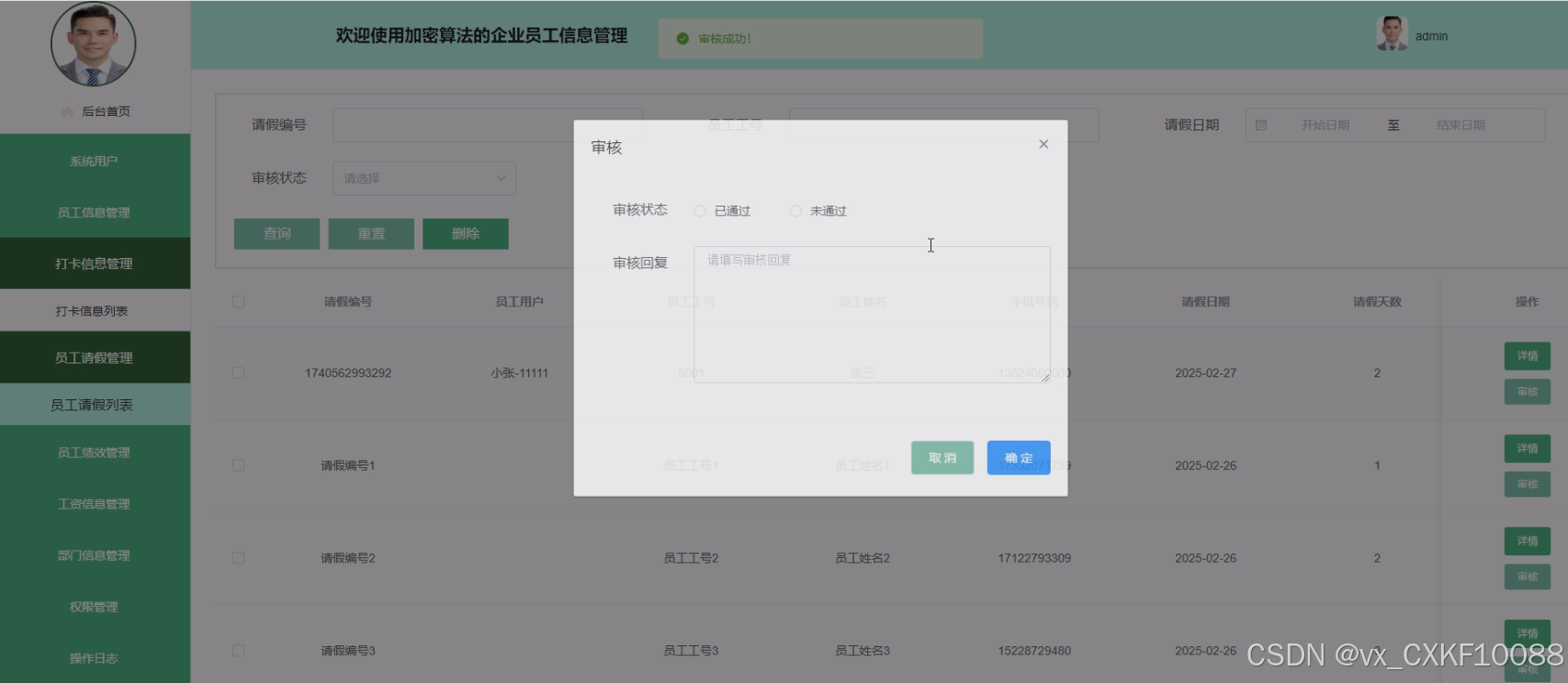 员工请假管理:展示员工请假列表。管理员管理所有员工请假信息,可查询、删除、审核员工的请假信息。请假审核界面如下图所示。