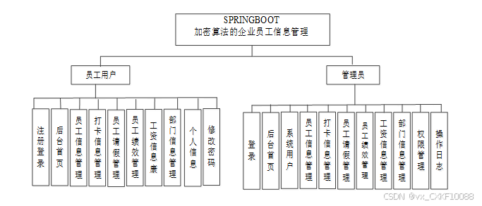 SPRINGBOOT 加密算法的企业员工信息管理系统主要涉及有员工用户、管理员两个角色。其中员工用户包含注册、登录、后台首页、员工信息管理、打卡信息管理、员工请假管理、员工绩效管理、工资信息管理、部门信息管理、个人信息、修改密码等功能;管理员包含登录、后台首页、系统用户、员工信息管理、打卡信息管理、员工请假管理、员工绩效管理、工资信息管理、部门信息管理、权限管理、操作日志等功能。每个角色对应的功能模块如图所示。
