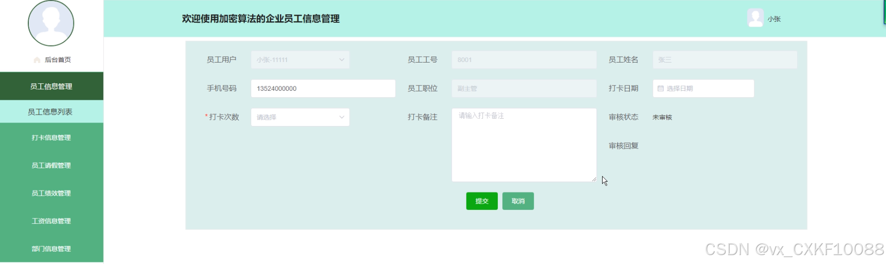 | 预期结果 | 提示提交成功,该员工打卡记录生成,管理员可查看到该打卡信息 |