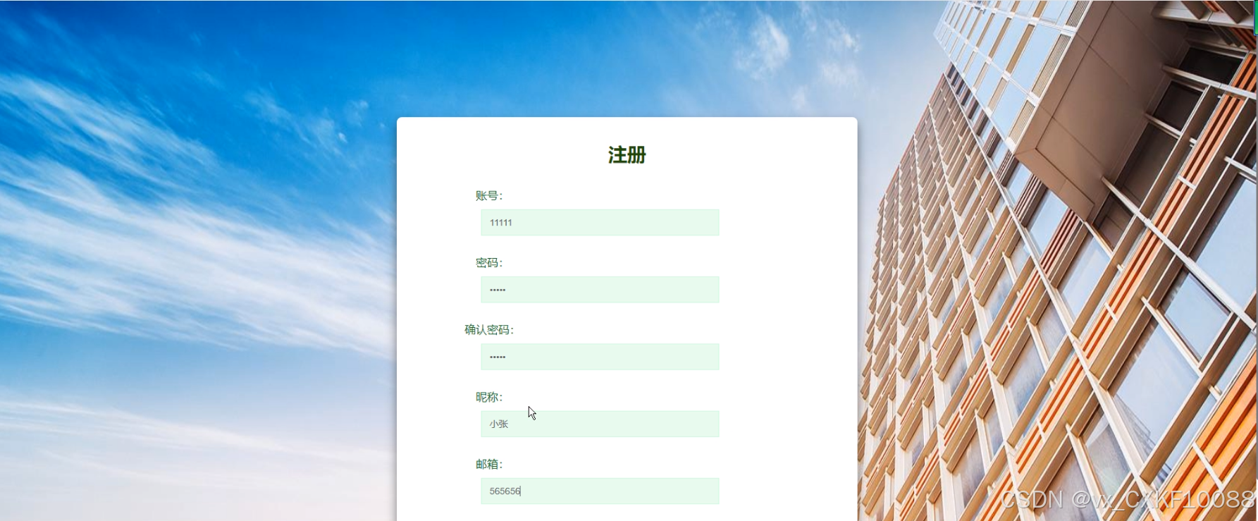 (1)用户注册:点击注册,进入注册页面,填写好账号、密码、确认密码、昵称、邮箱、身份:员工用户、员工工号、员工姓名、身份证号等字段值,点击下方注册按钮,提示注册成功后,系统将自动跳转回到登录页面。