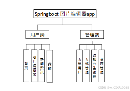 本系统为图片编辑器APP提供全面支持,涵盖管理员、用户两种角色功能。系统功能结构图如图4-2所示。