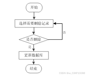 用户首先选择需要删除的记录,然后系统判断是否执行删除操作。如果用户选择不删除,则返回重新选择;如果选择删除,则更新数据库完成记录删除操作,最后结束流程。如图3-6所示。