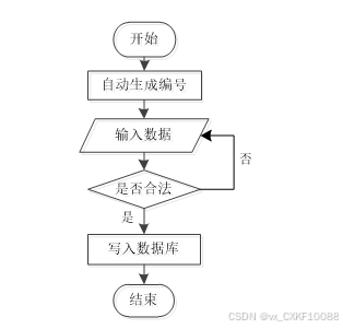 系统开始后自动生成编号,用户输入数据。系统判断输入的数据是否合法,若不合法则返回重新输入;若合法,则将数据写入数据库,最后结束流程。如图3-5所示。