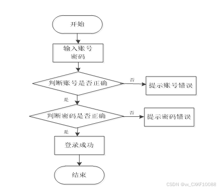 用户输入账号和密码后,系统首先判断账号是否正确,若不正确则提示“账号错误”;如果账号正确,则继续判断密码是否正确,若密码错误则提示“密码错误”;若账号和密码均正确,则显示“登录成功”,最后结束流程。如图3-4所示。