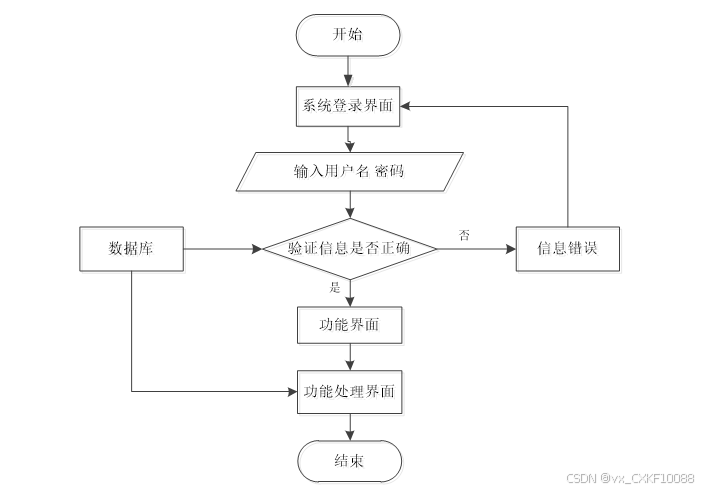 用户从“系统登录界面”开始,输入用户名和密码后,系统验证其信息是否正确。如果验证通过,则进入功能界面并进一步进入功能处理界面,最后流程结束;如果验证失败,则显示“信息错误”,用户需要重新输入。数据库支持验证过程。如图3-3所示。