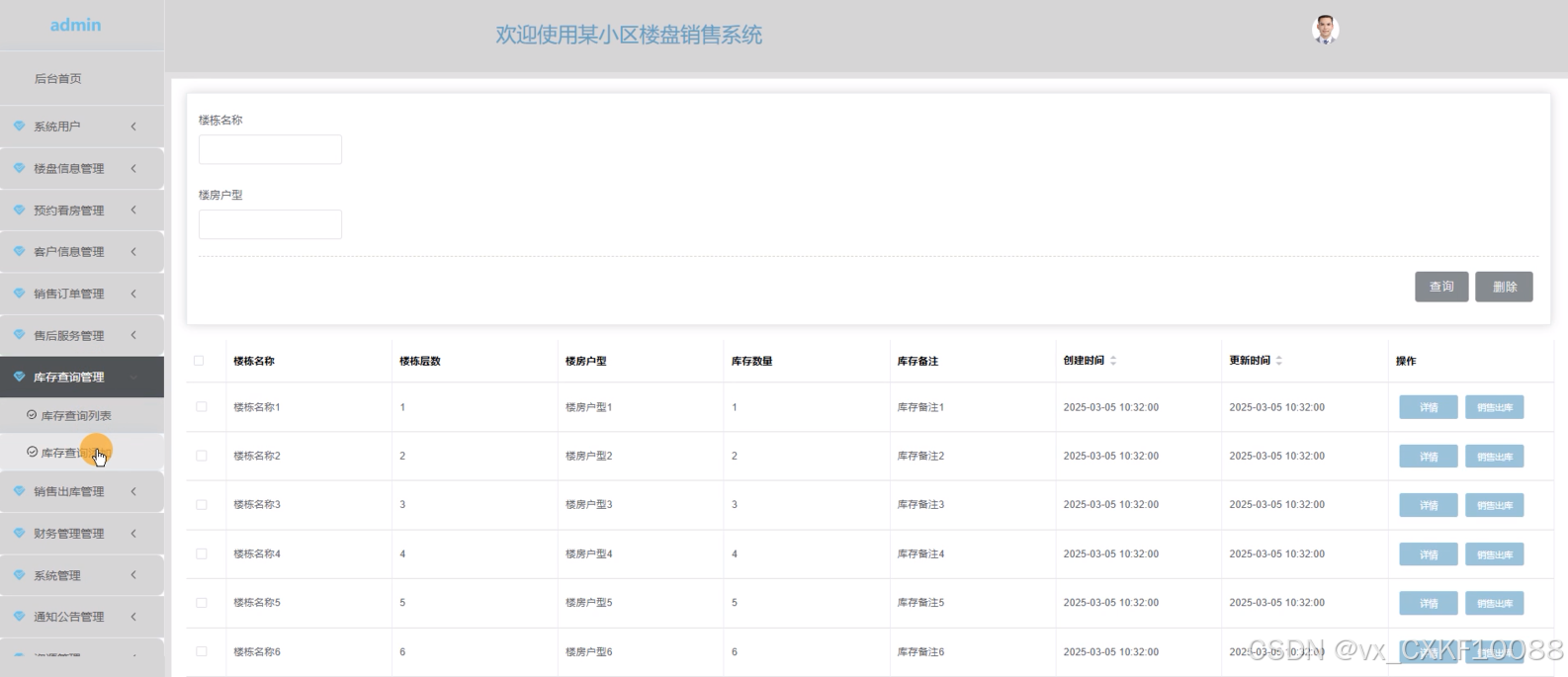 - 库存查询管理:管理员可以查询、添加和管理销售出库信息,包括楼栋名称、层数、库存数量等,确保库存数据的准确性和及时更新。