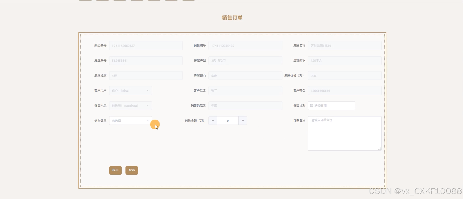 This system adopts the SpringBoot framework, Java language, MySQL database, and Vue.js front-end technology, combined with modern development concepts, to design and implement an integrated community real estate sales system. The main functions of this system include user management, real estate information management, reservation viewing, customer information management, sales order management, after-sales service, inventory inquiry, sales outbound, financial management, notification announcements, real estate information, and information classification modules.