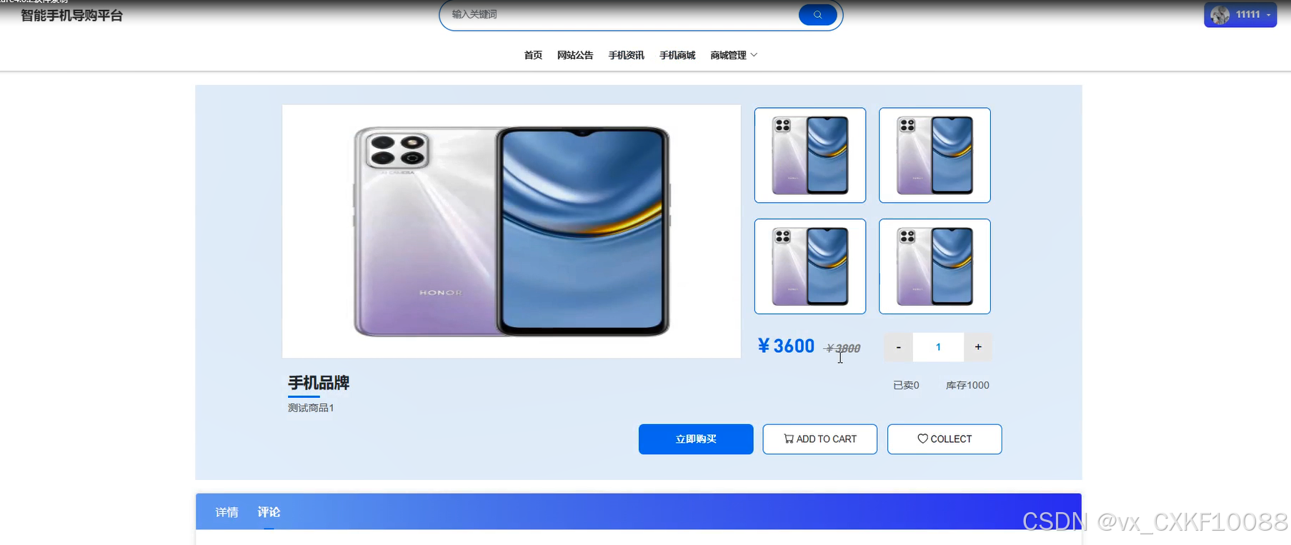 手机商城:浏览手机商品列表并查看详情,可在首页手机商城浏览,协同过滤算法导购喜欢的手机手机商品,点击可进行购买、点赞、收藏和评论操作。