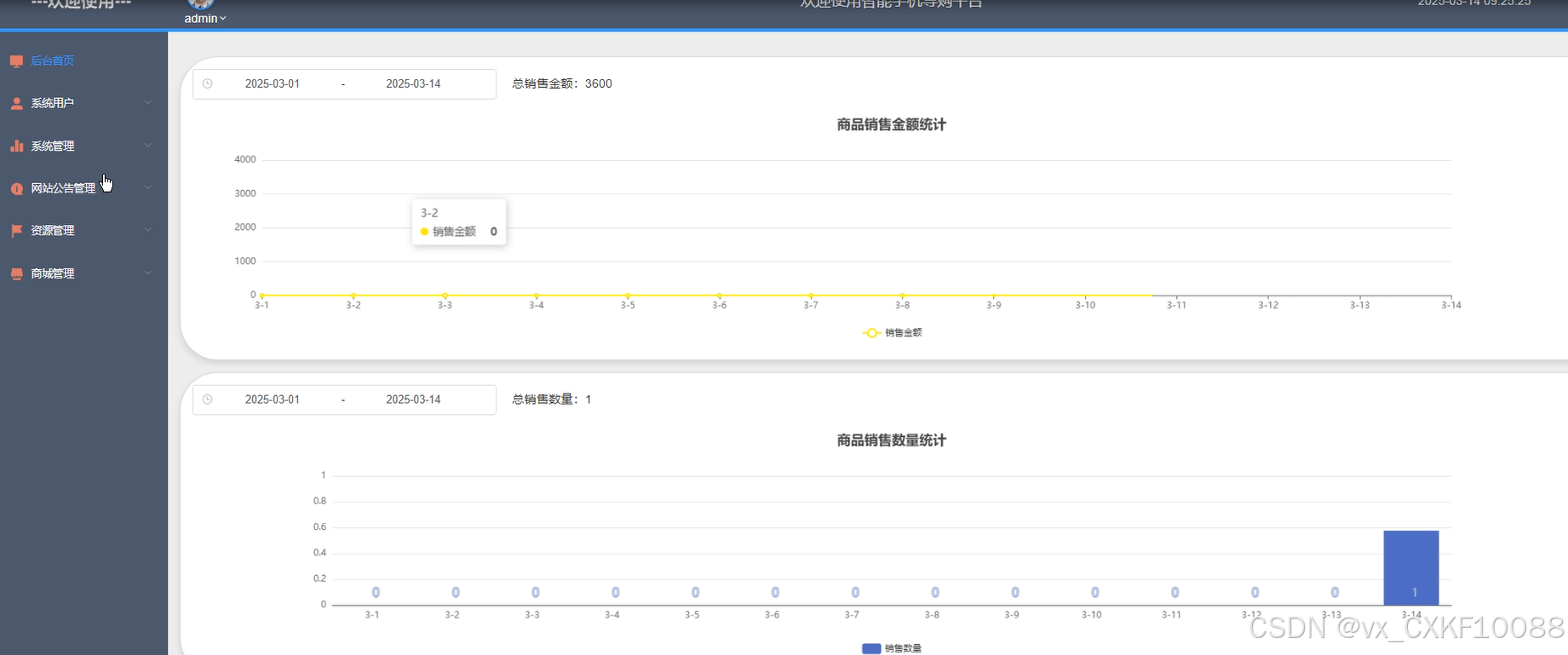 后台首页:展示平台关键数据统计,如用户数、手机购买量、订单量统计等。支持图表化展示以辅助决策。